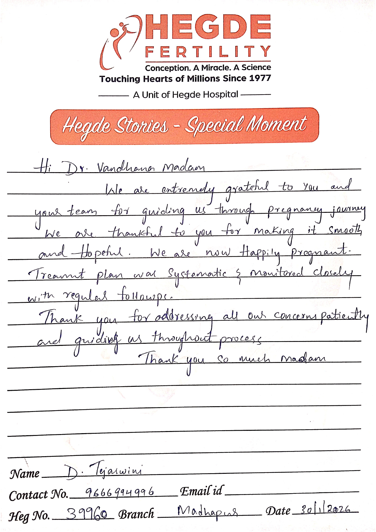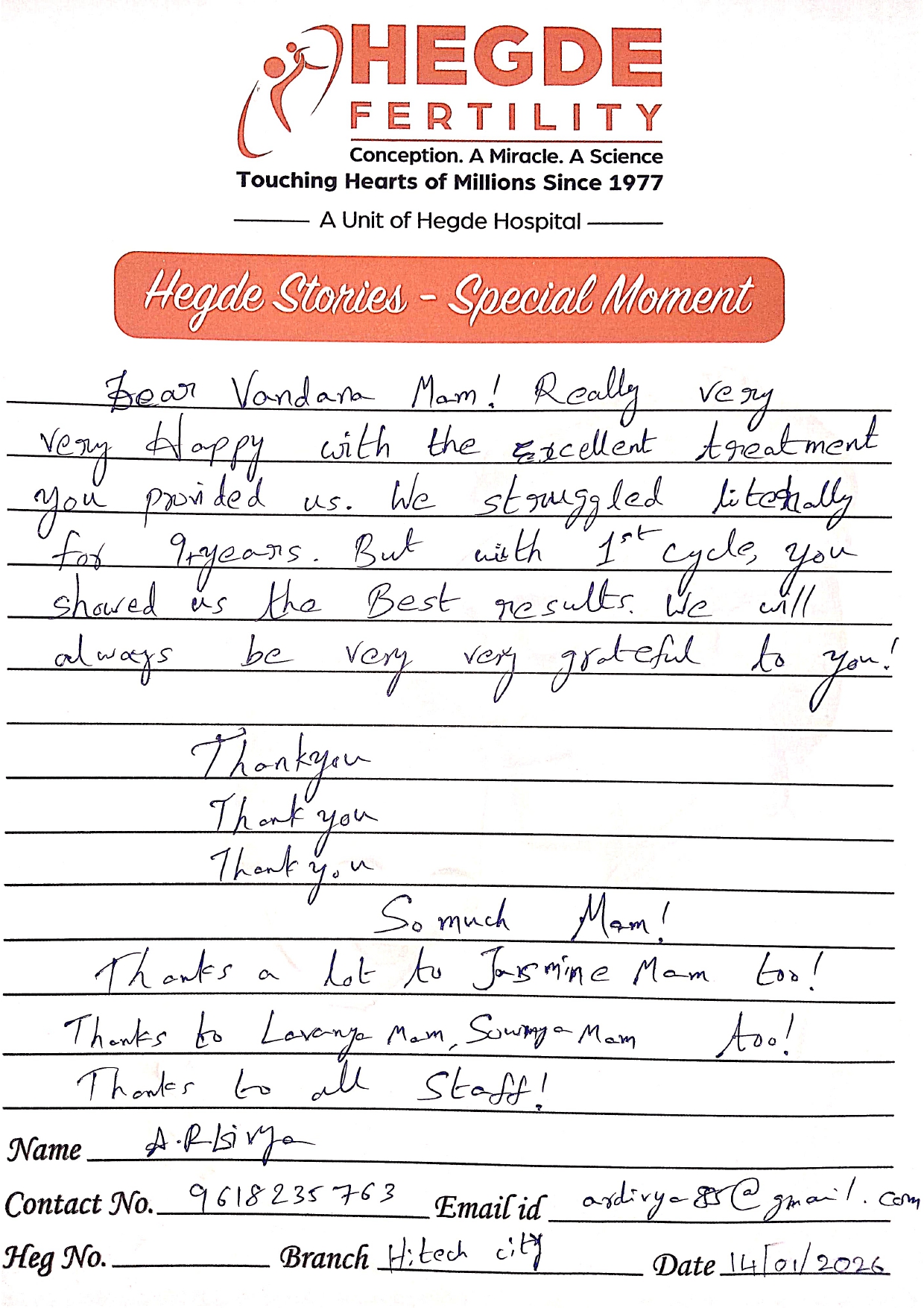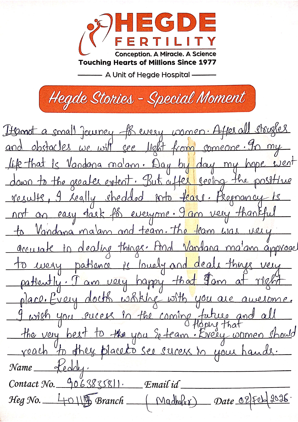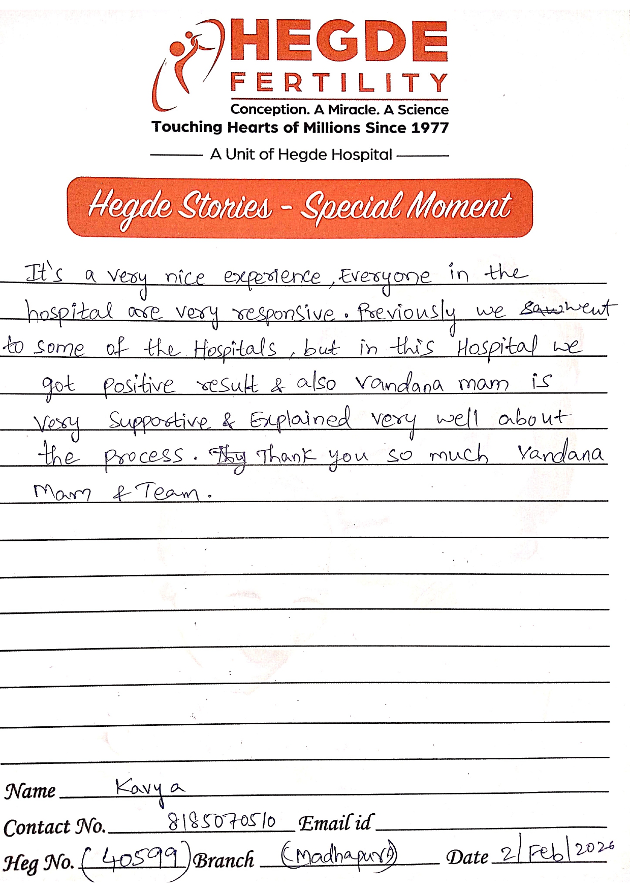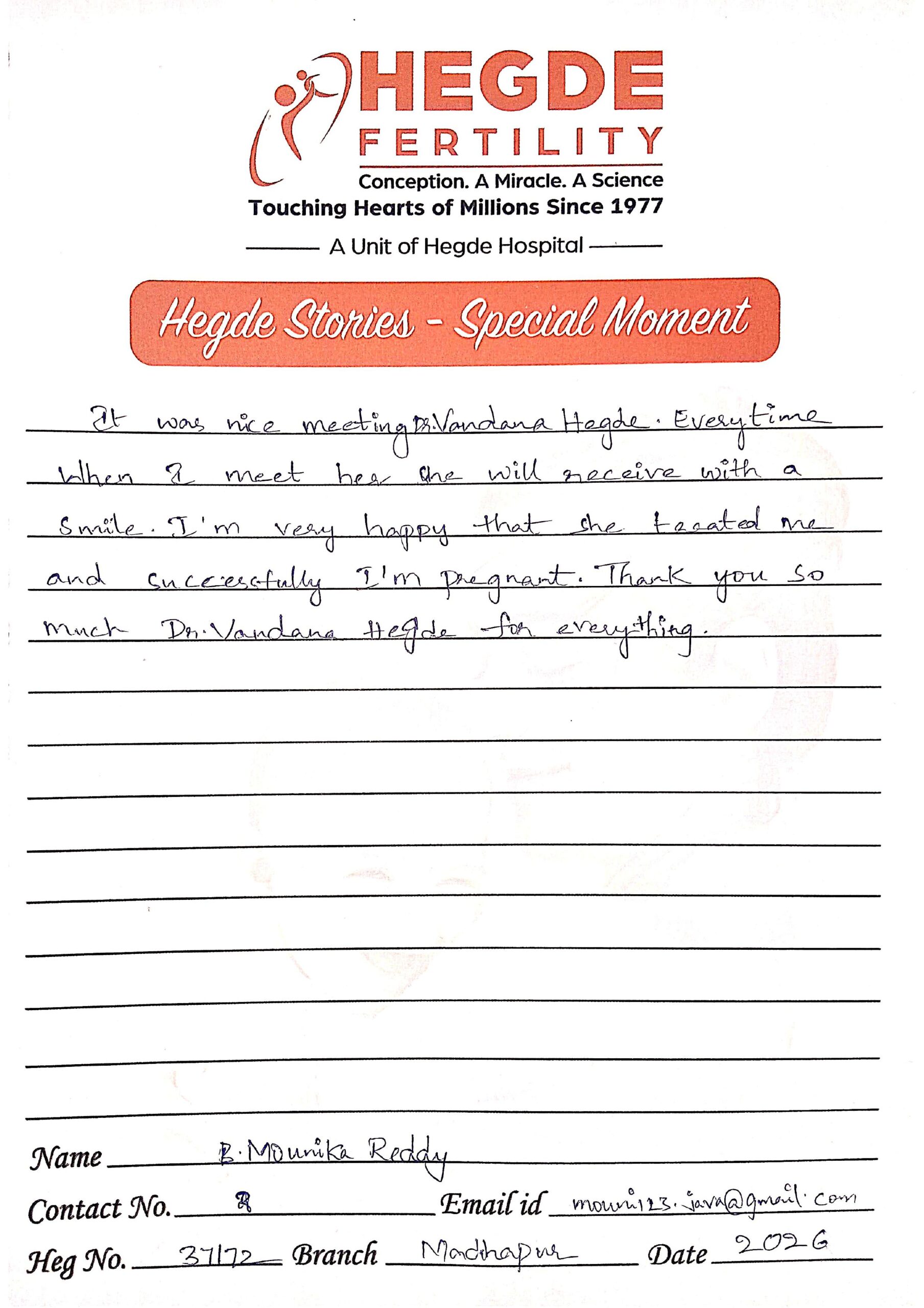 You can’t ask for more from the Hegde Hospital and Dr. Vandana, ma’am. We got the good news on the first attempt. After a long journey, we finally got this news. I must say thanks to the entire staff as well. Everyone is so supportive and cooperative. They helped us with all our queries and understood the emotions we were going through. Thank you so much for everything.