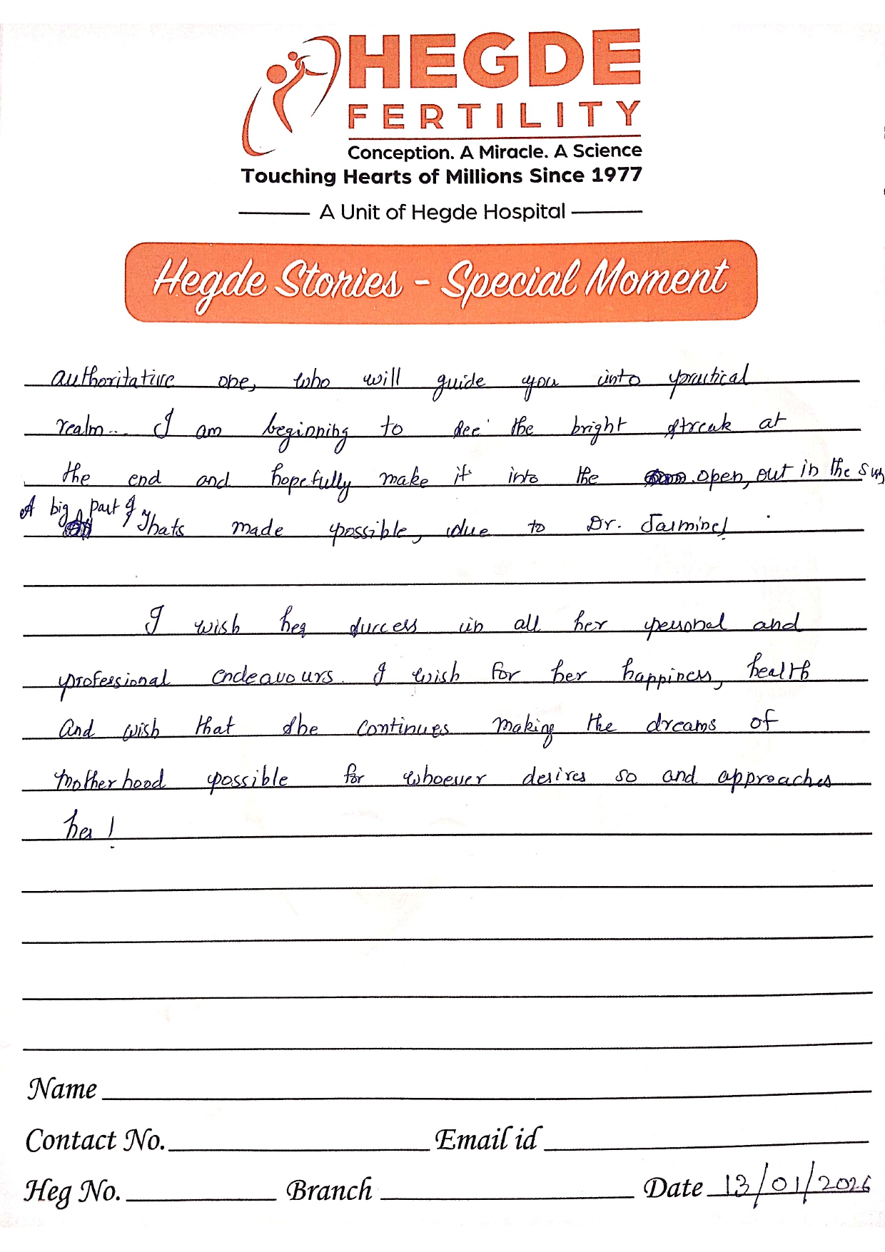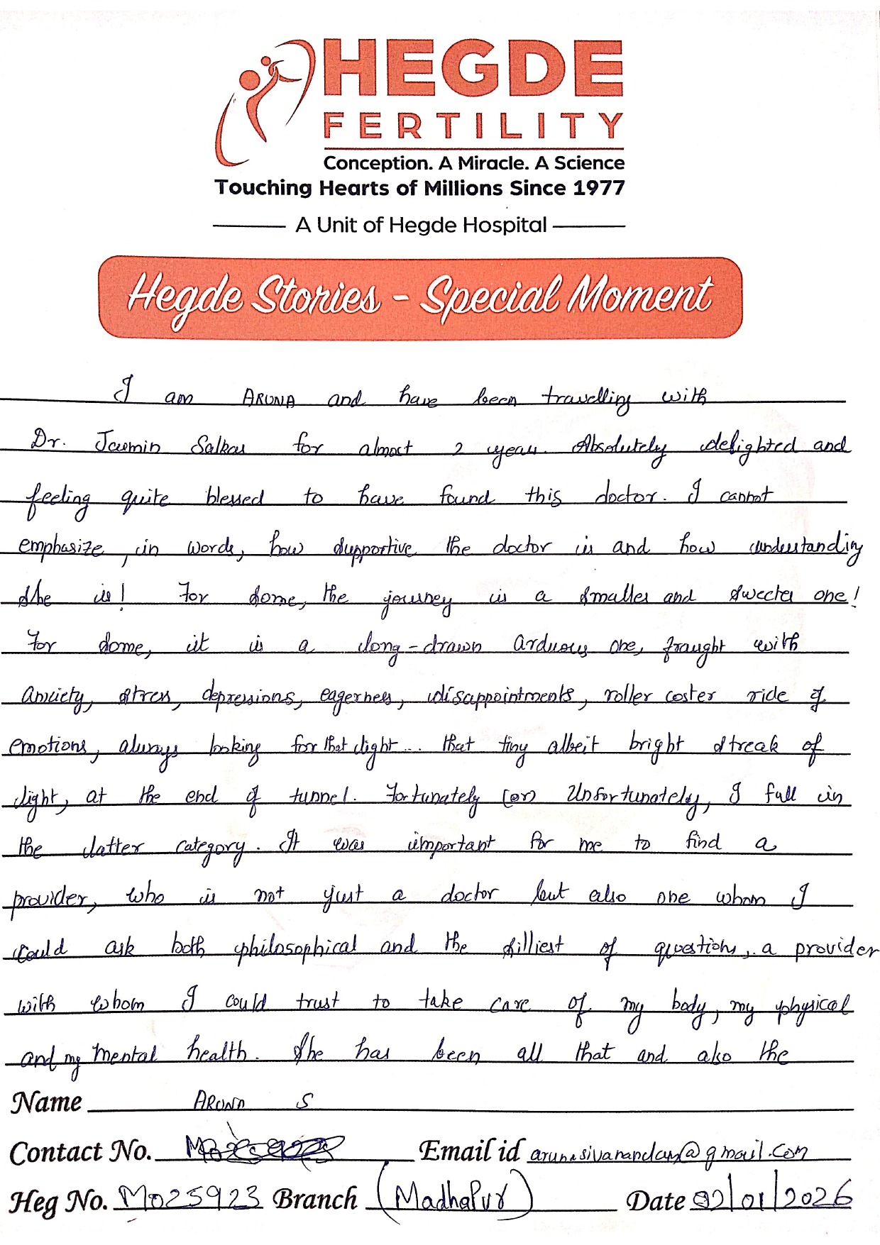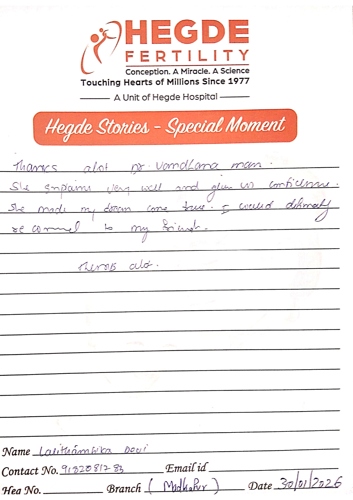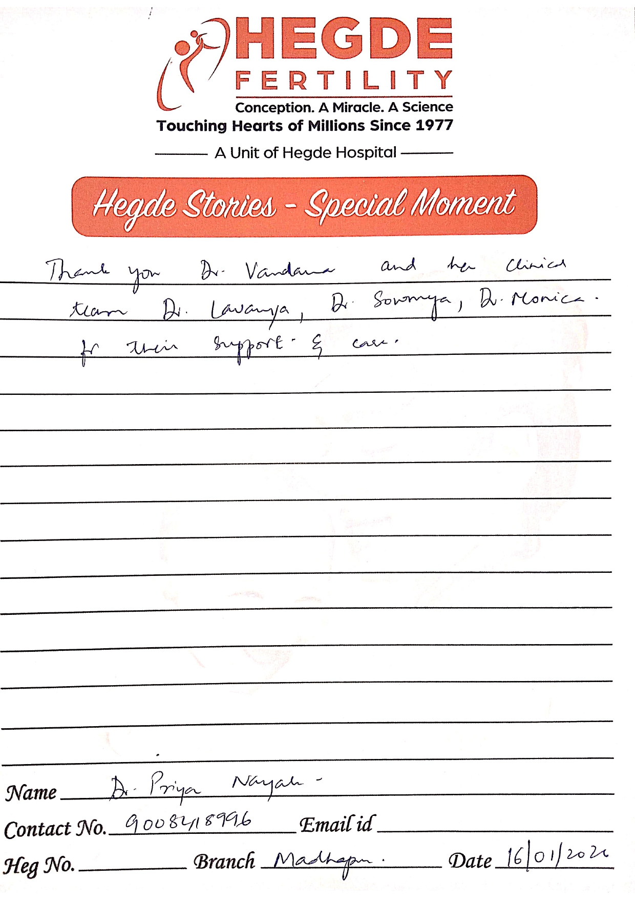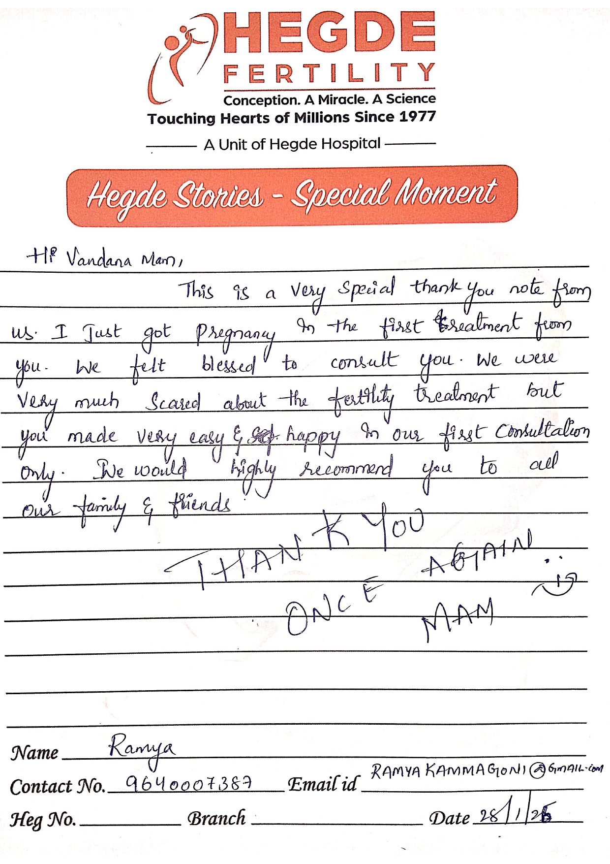 You can’t ask for more from the Hegde Hospital and Dr. Vandana, ma’am. We got the good news on the first attempt. After a long journey, we finally got this news. I must say thanks to the entire staff as well. Everyone is so supportive and cooperative. They helped us with all our queries and understood the emotions we were going through. Thank you so much for everything.